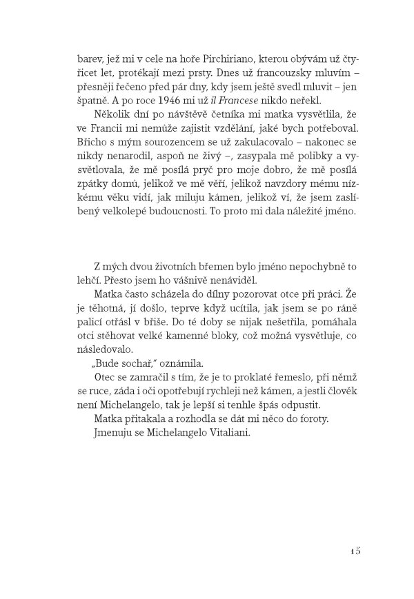Během svých posledních hodin, na pomezí vzpomínek a blouznění, se sochař Mimo Vitaliani noří do příběhu svého života. Do let, kdy žil jako učedník u tyranského kameníka v italském městečku Pietra d’Alba, v srdci panství rodiny Orsiniů. A především do chvíle, kdy poznal jejich jedinou dceru – nezkrotnou Violu.