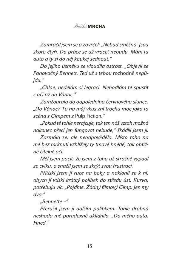 "Má matka mi vždycky říkala, abych si našel ženu, která mi bude rovna ve všech směrech. „Nepřipusť, aby ses zamiloval do někoho, kdo bude upřednostňovat tvůj svět před svým. Zamiluj se do někoho, kdo bude žít stejně neohroženě jako ty. Najdi si ženu, kvůli které budeš chtít být lepším mužem.“ Rozhodně jsem si našel ženu, která je mi ve všem rovna, ženu, která z mého života udělala peklo na zemi a žila jen proto, aby mě popouzela. Ženu, kterou bych nejradši umlčel lepicí páskou… a kterou jsem chtěl stejnou měrou políbit. Moje přítelkyně, bývalá stážistka, slečna Chloe Millsová. Božská mrcha."