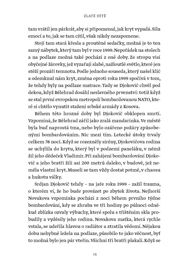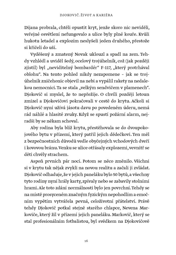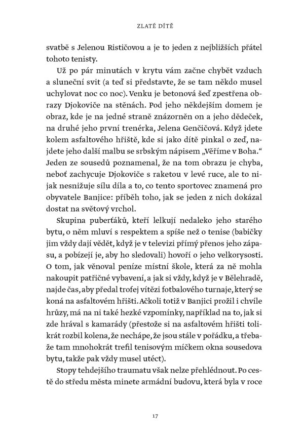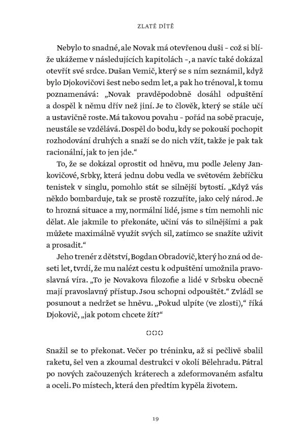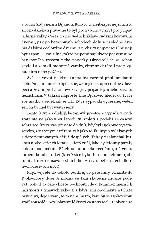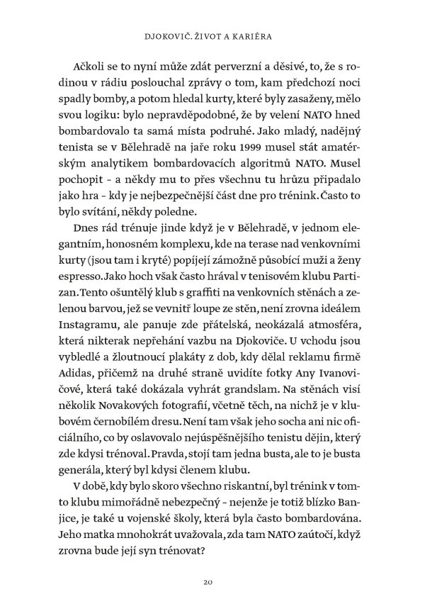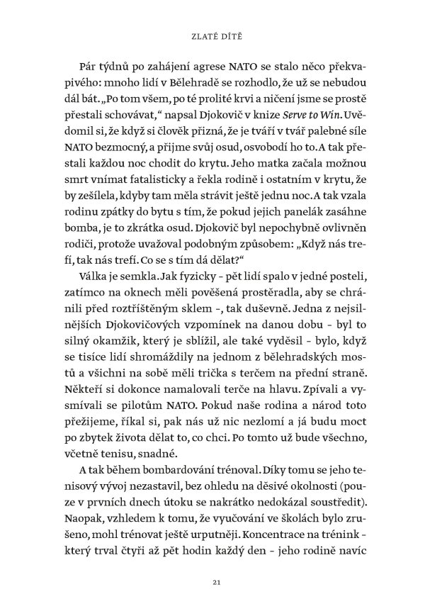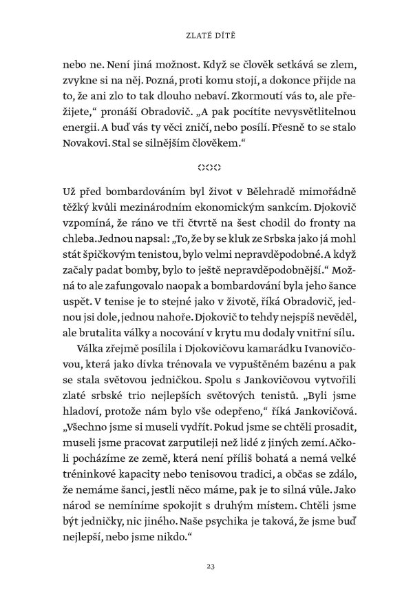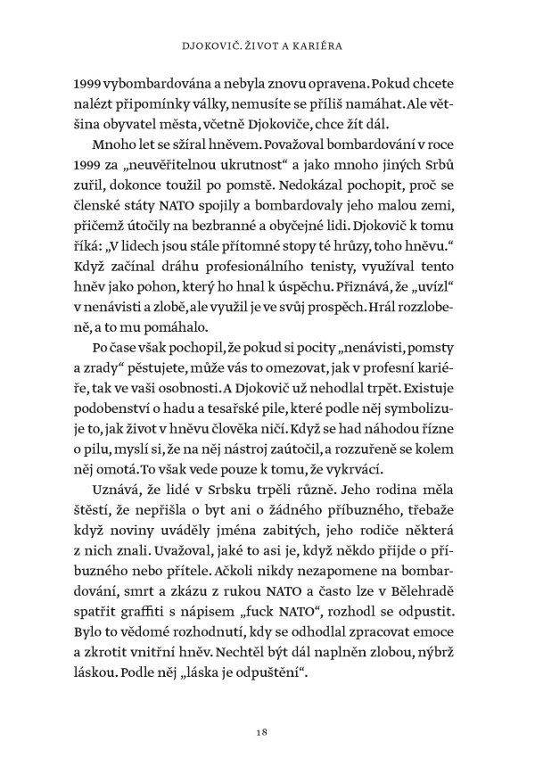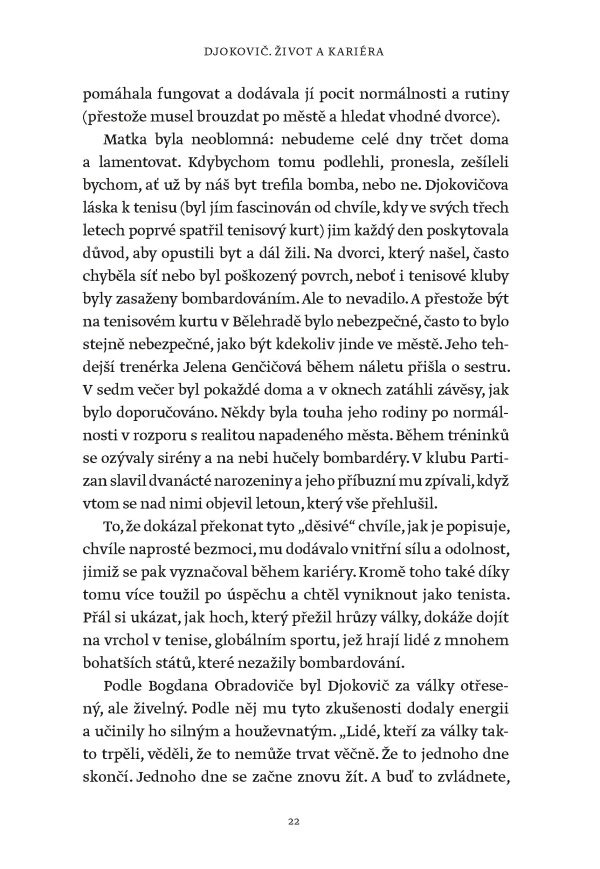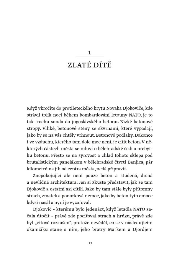 Žádný muž ani žena nevyhráli víc grandslamových titulů v singlu než Novak Djokovič, který svého čtyřiadvacátého grandslamového vítězství dosáhl na US Open v roce 2023. Tato fascinující kniha však není jen příběhem vítězství a přehlídkou trofejí. Je to hlubinný ponor do duše jedné z nejúžasnějších a nejkontroverznějších osobností v dějinách sportu. Je založena na rozhovorech s lidmi blízkými Djokovičovi, včetně jeho přátel a rádců, někdejších trenérů i rivalů. Je to sonda do neúnavné touhy po dokonalosti, která ho žene kupředu – často cestami, jež se vymykají běžnému chápání.