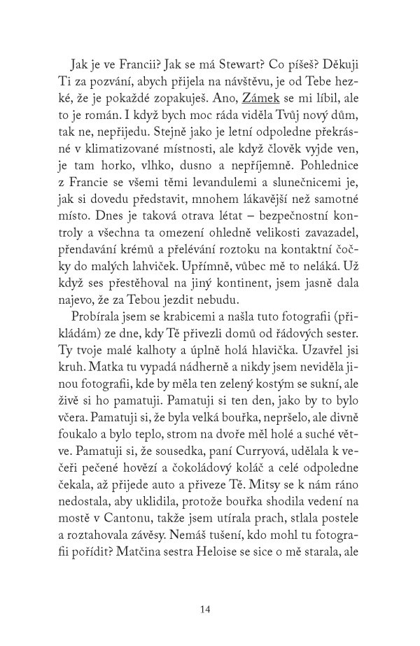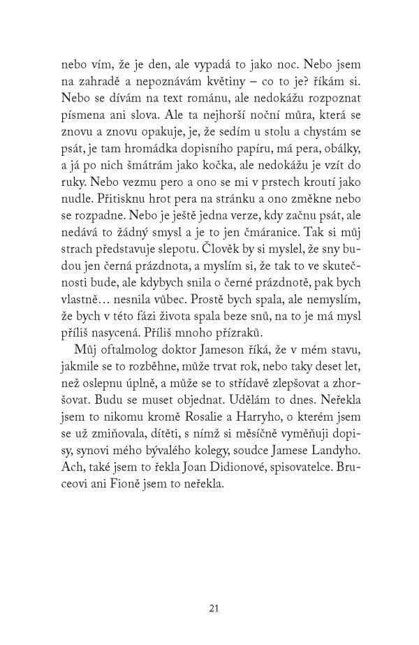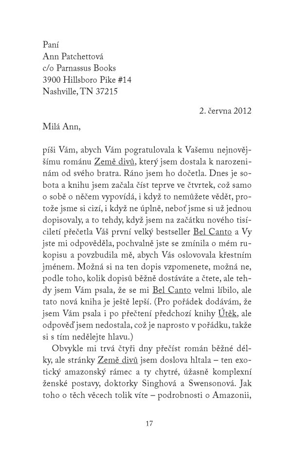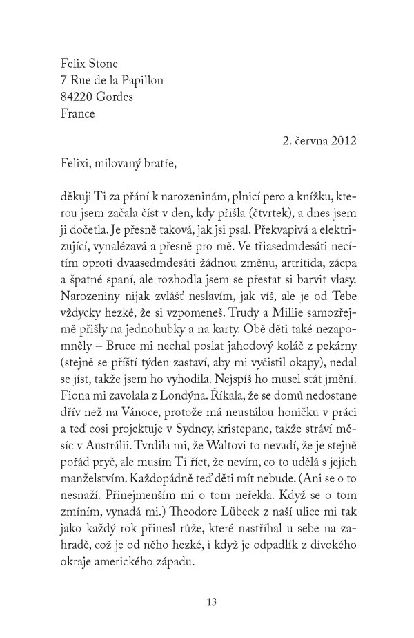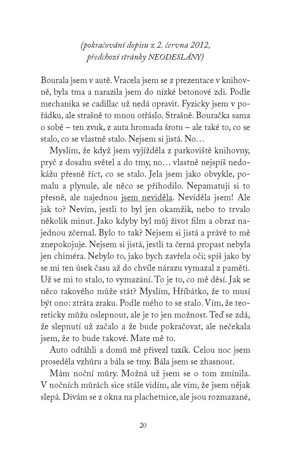 Teď však hrozí, že ji o lásku k psaní připraví horšící se vada zraku. Když ji navíc dávná korespondence donutí znovu otevřít jedno z nejbolestivějších období jejího života, uvědomí si, že dopis, který píše už roky, je třeba konečně odeslat. A především najít ve svém srdci sílu k odpuštění.