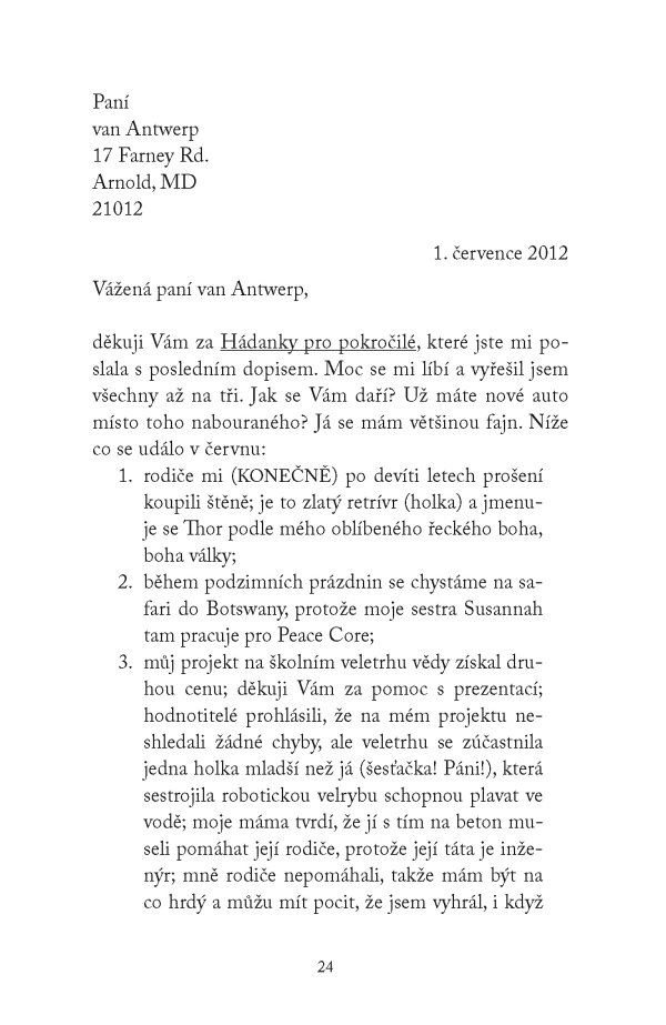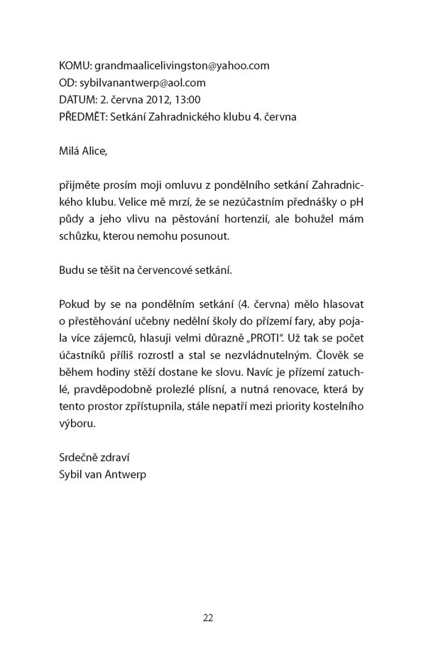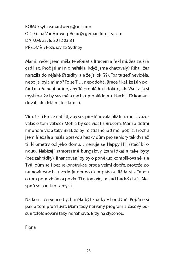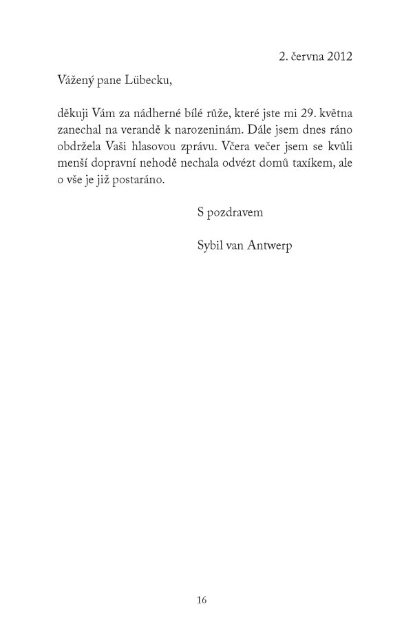 Osamělá sedmdesátnice Sybil van Antwerp má za sebou nelehký rodinný život i mimořádnou právnickou kariéru. Odjakživa používala dopisy k tomu, aby lépe porozuměla světu a svému místu v něm. Inteligentní, tvrdá, pedantská a emočně zraněná Sybil v pravidelně vedené korespondenci s rodinou, přáteli, oblíbenými spisovateli i úplnými cizinci nepřímo odhaluje střípky ze své profesní minulosti, složité rodinné problémy, strach z nemohoucnosti ve stáří a nutkavou potřebu vědět, kdo jsme a kam patříme.