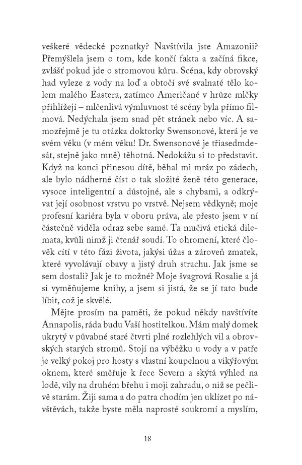 „Dočetla jsem tuto nádhernou knihu v slzách a musela jsem se chvíli dávat dohromady. Stejným dílem je v ní obsažený smutek a tichá radost. Rozesměje vás i rozpláče, donutí vás přemýšlet, jako to dělají všechny nejlepší romány. Čtěte, čtěte, čtěte! A kupte ji své rodině a přátelům.“
