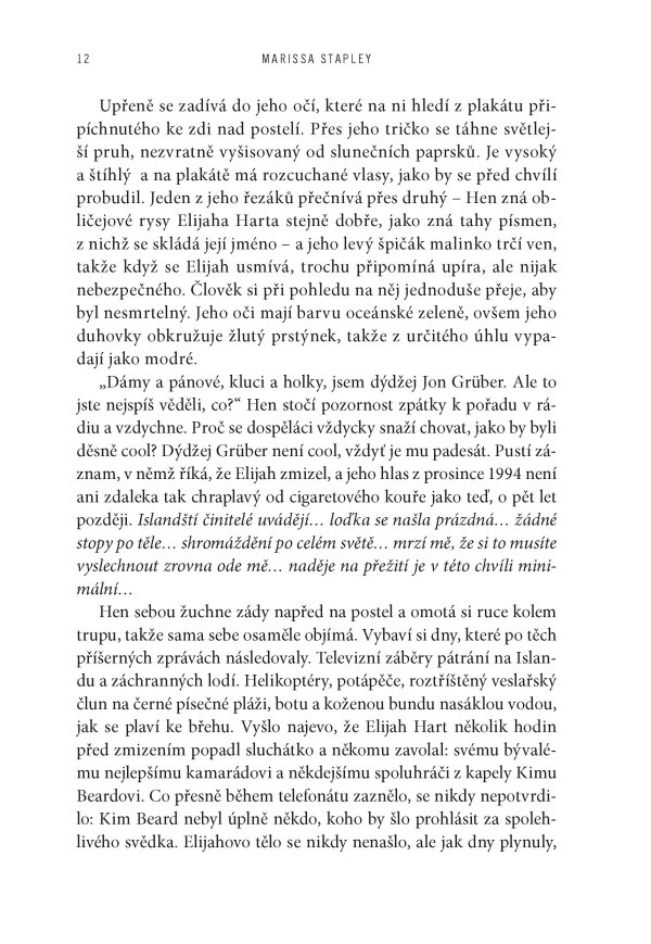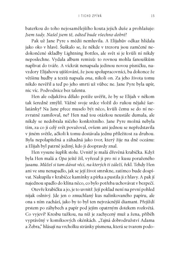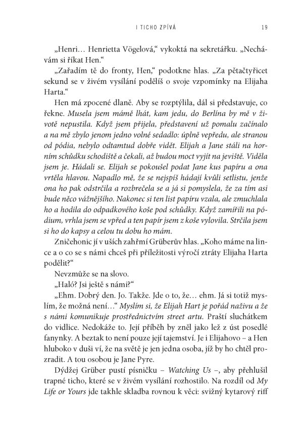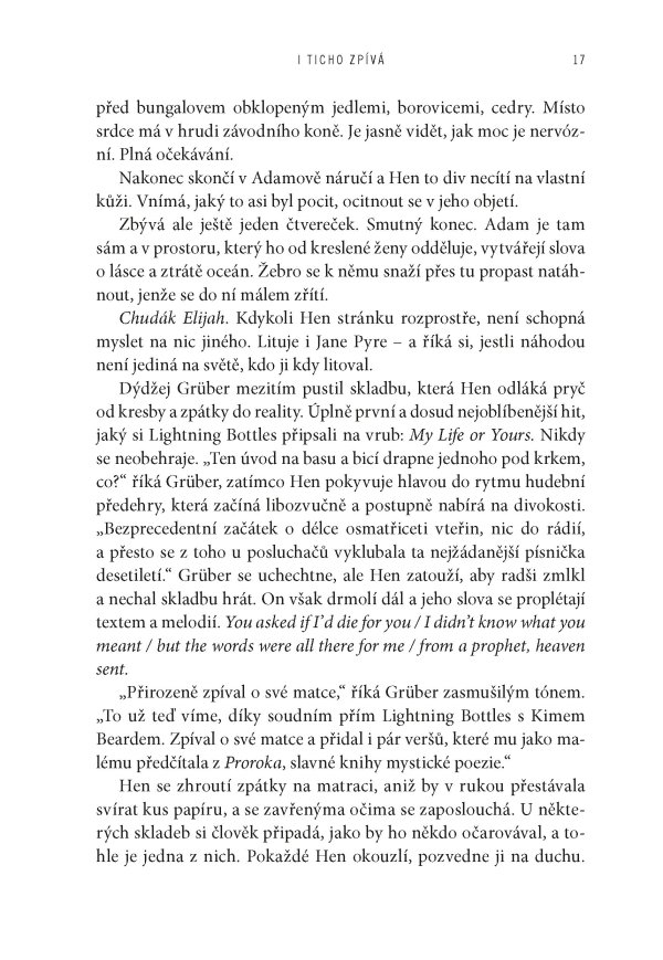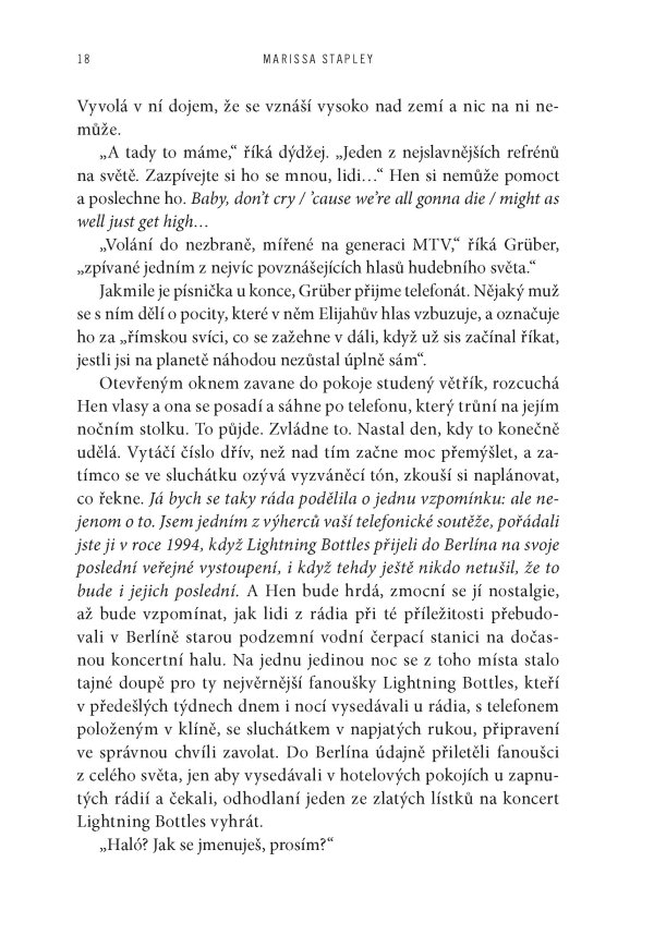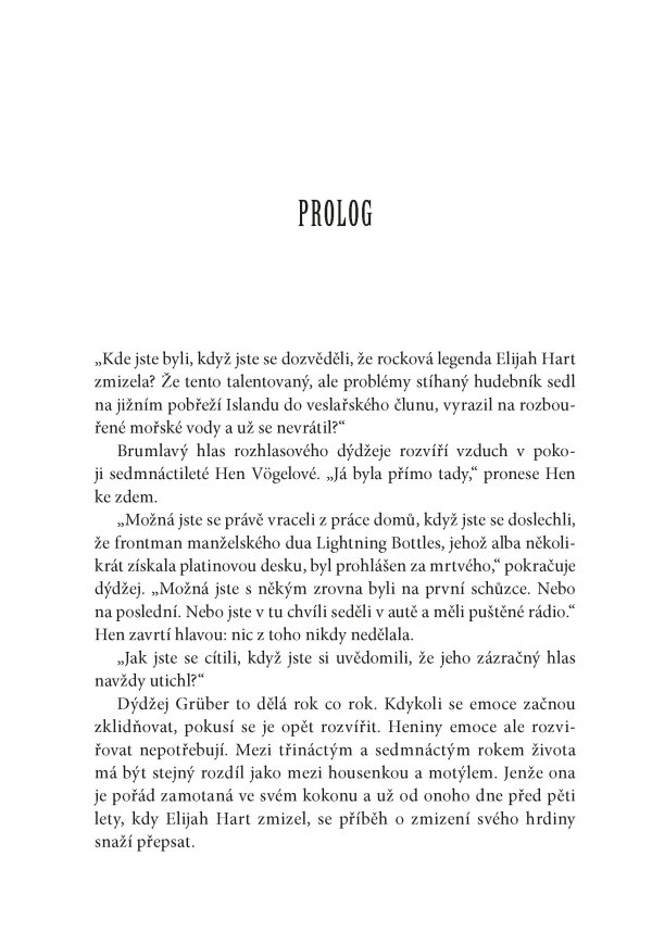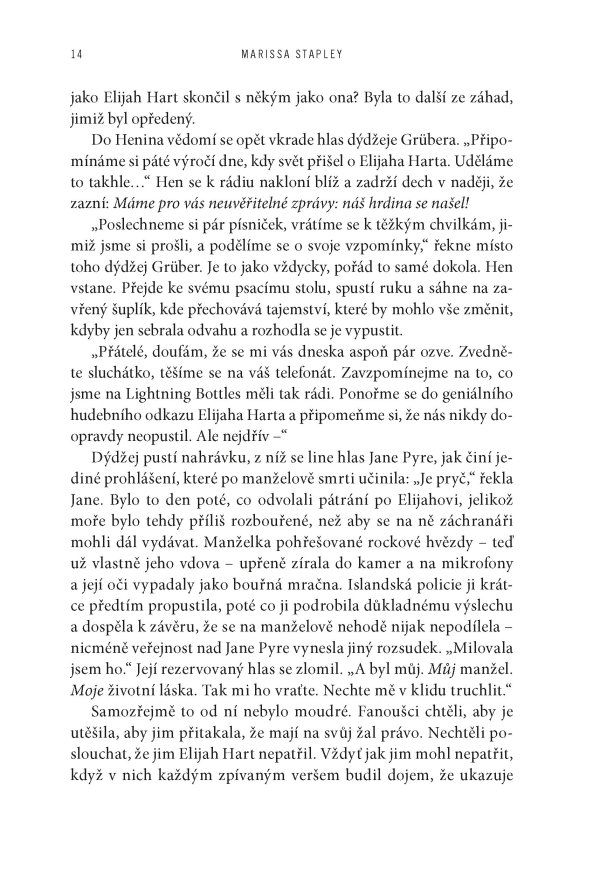 Když se Jane Pyre poprvé setkala s charismatickým Elijahem Hartem, byli oba skoro ještě děti – dva neklidní outsideři, které spojila vášeň pro hudbu a okamžité, spalující pouto. Společně založili kapelu The Lightning Bottles, která se během několika let vyšvihla ze zapadlých seattleských klubů až na přední příčky světových hitparád. Jejich láska byla stejně intenzivní a nevyzpytatelná jako písně, které psali – a které promlouvaly k celé generaci. Jenže sláva má svou daň. A když Elijah beze stopy zmizí, podezření a nenávist se obrátí proti Jane.