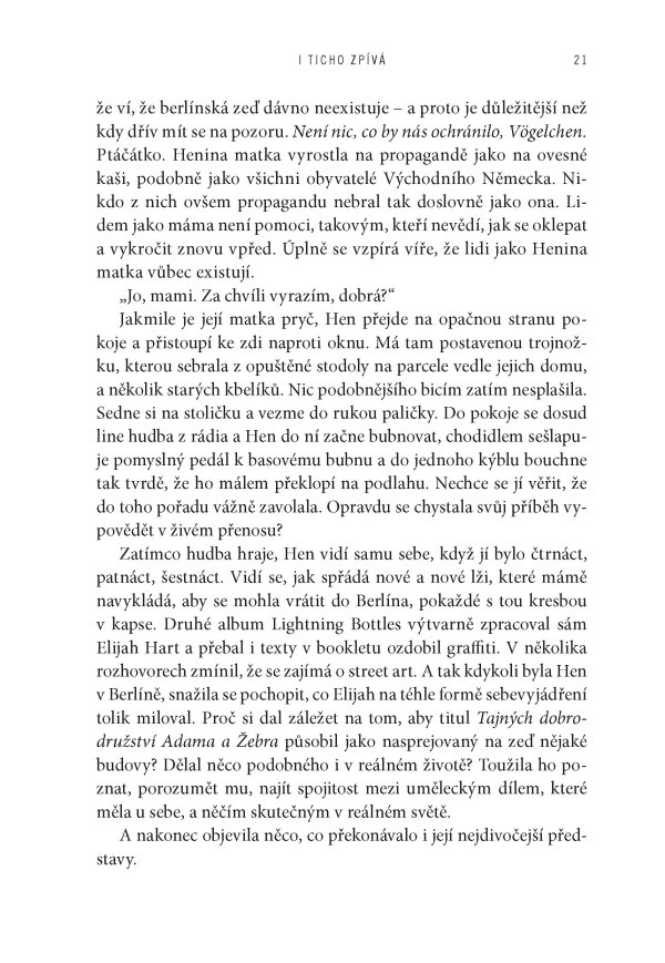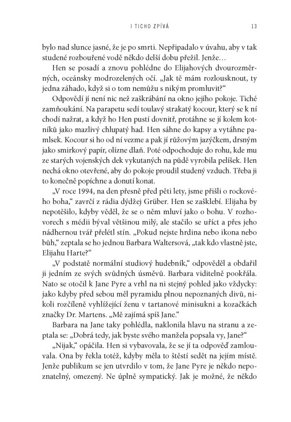 „Román I ticho zpívá je ódou na rock, devadesátá léta a schopnost hudby rovnou měrou zraňovat i uzdravovat. Tato kniha uspokojí každého, kdo se poohlíží po příběhu o bouřlivé lásce nebo má chuť rozlousknout spletitou záhadu. Počítejte s tím, že ústřední duo vám uvízne v srdci i mysli.“