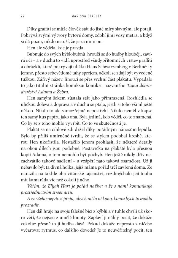 „Kniha je ideální volbou pro fanoušky Daisy Jones and the Six nebo Zrodila se hvězda. Nadaná dvojice se vyšvihne na samý vrchol, ale sláva zničí její největší sny. Stapley se dívá na zoubek tomu, jak se v hudebním průmyslu zachází se ženami, a rozplétá přitažlivou záhadu, kvůli níž se postavy vydávají na mezinárodní honbu za vodítky. Divoká jízda, která vám vyrazí dech.“