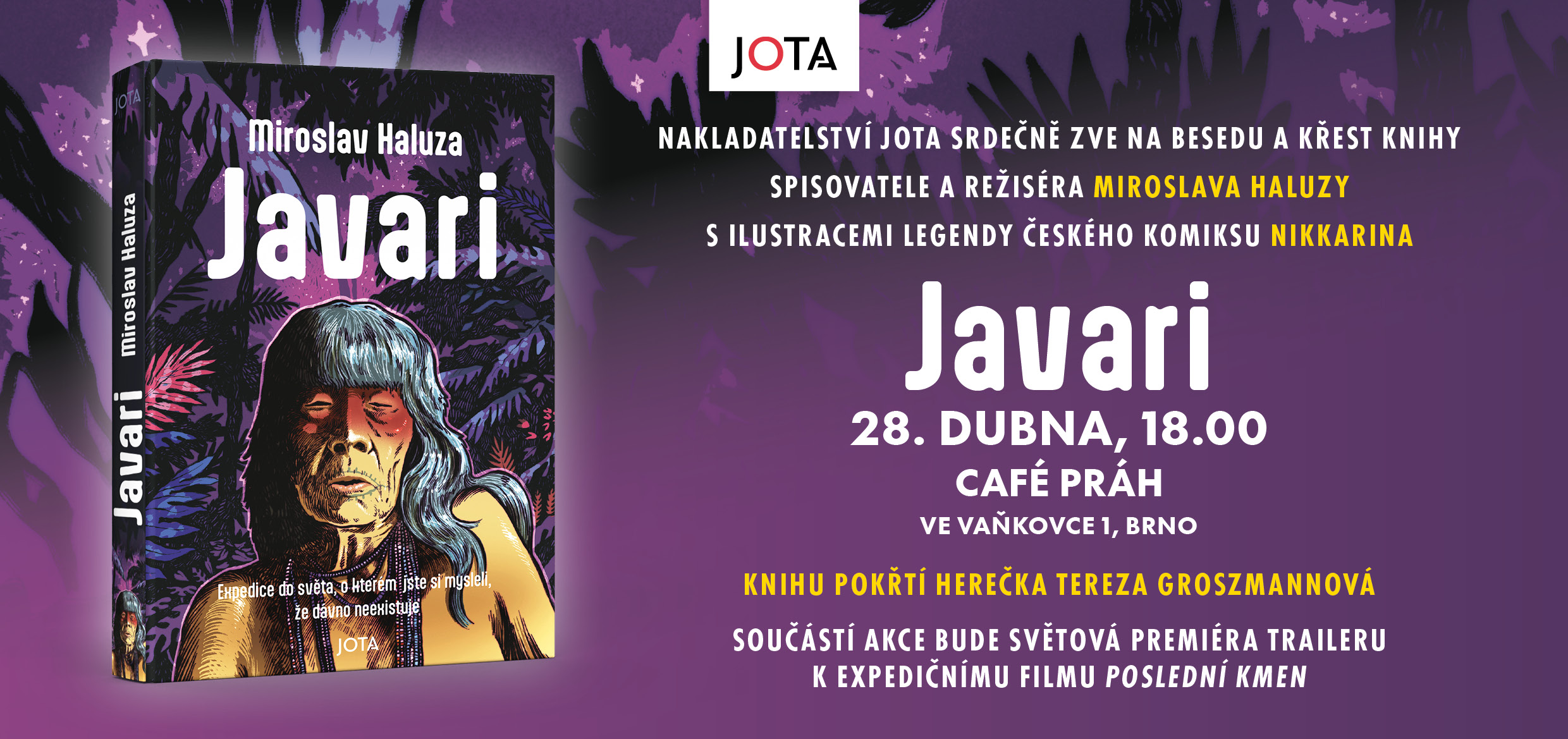 Když Brňák s Ostravákem vyrazí za dobrodružstvím k amazonské řece Javari, je to jízda! Pralesní divočina, bezedné močály, hadi, indiáni, odhodlání, humor, autentické fotografie a ilustrace od výtvarníka Nikkarina v cestopisu Javari pohltí i vás. Kniha bude na místě k zakoupení i podepsání.