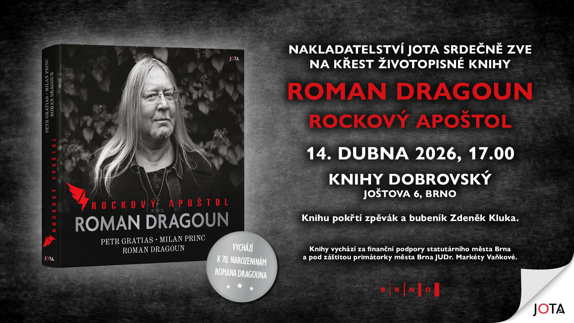 Srdečně zveme na křest knihy Roman Dragoun. Rockový apoštol spojený s autogramiádou a besedou rockové legendy Romana Dragouna a autora Petra Gratiase. Kniha vychází k 70. narozeninám Romana Dragouna. Kmotrem knihy se stane zpěvák a bubeník Zdeněk Kluka.