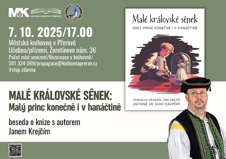 Zveme vás na představení knihy Malé královské sênek, které se uskuteční v úterý 7. října 2025 od 17 hodin v přednáškové místnosti Městské knihovny v Přerově. Spoluautor Jan Krejčí představí hanácké převyprávění Malého prince přerovské veřejnosti.
