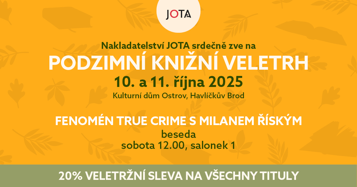 Zvláštní pozvání přijměte na sobotu 11. října, kdy se od 12 hodin uskuteční povídání o naší edici True Crime společně s Milanem Říským a Matějem Bregantem. Moderuje Renata Růžová.