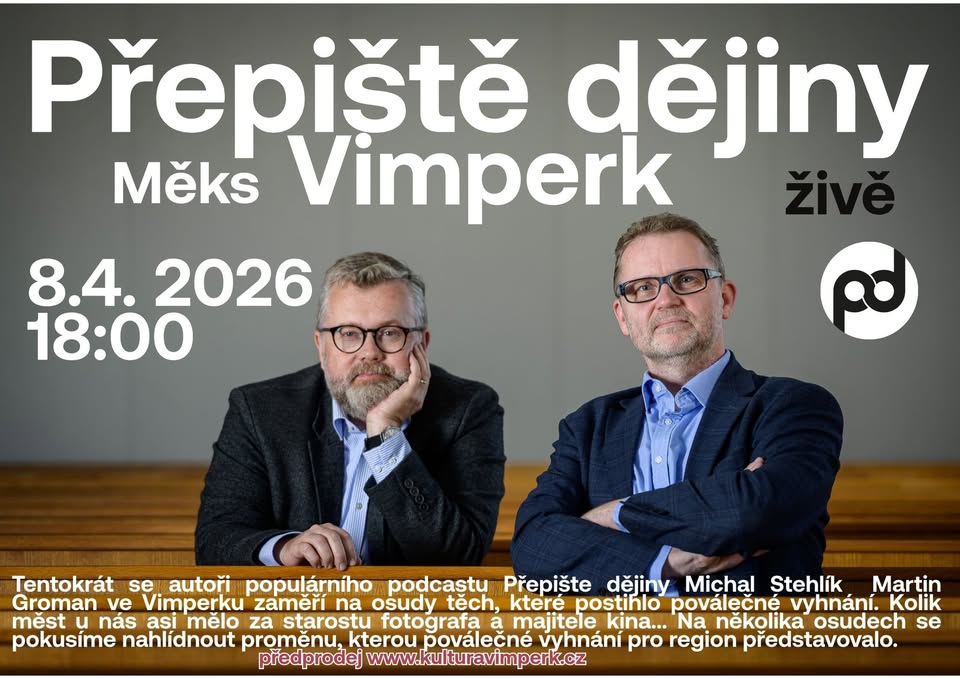 Srdečně vás zveme na živé natáčení podcastu Přepište dějiny s Michalem Stehlíkem a Martinem Gromanem, tentokrát ve Vimperku, kde se autoři zaměří na osudy těch, které postihlo poválečné vyhnání.