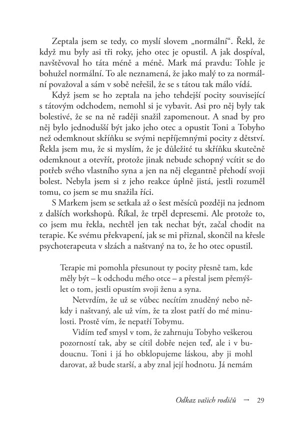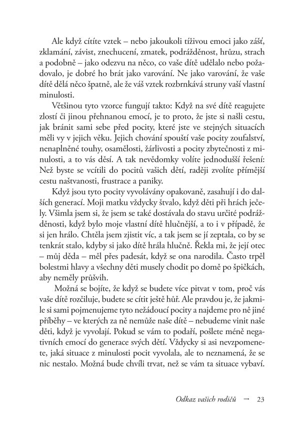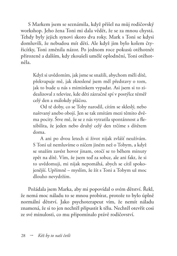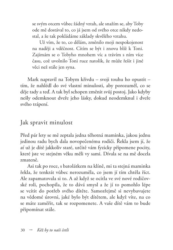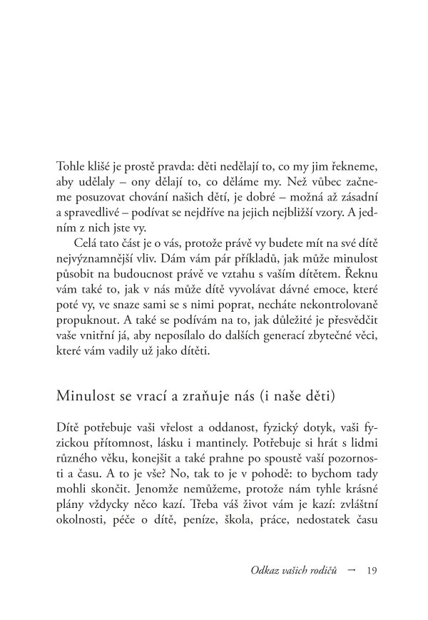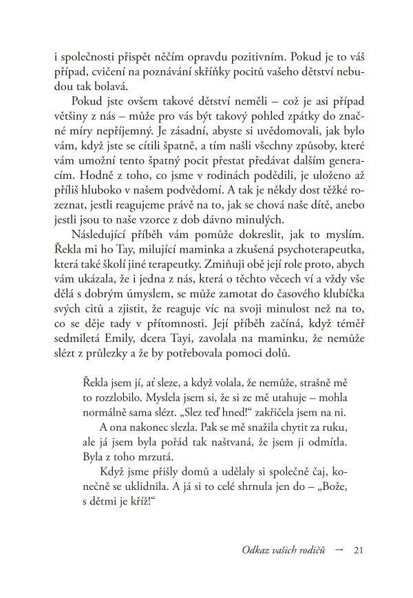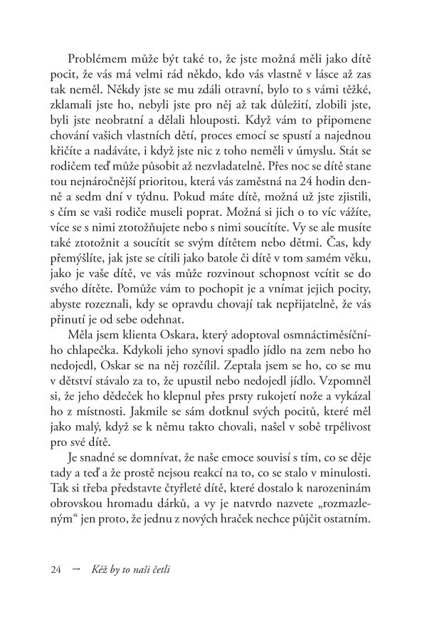 V této poutavé, chytré a vřelé knize vám zkušená psychoterapeutka Philippa Perryová řekne, na čem opravdu záleží a jakému chování je důležité se vyhýbat – zásadní pro a proti v rodičovství. Její příběh začíná u rodičů samotných, u toho, jak se v minulosti utvářela a vyvíjela jejich vlastní psychika – a jak toto všechno může také ovlivnit jejich vlastní rodičovství. Místo toho, aby tvořila „dokonalý“ plán, nabízí Phillipa barvitý pohled na prvky, které vedou k hezkému vztahu mezi dítětem a rodičem. Tato osvěžující a neodsuzující kniha vám pomůže: