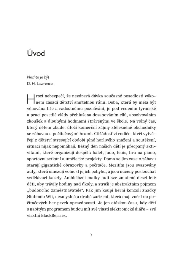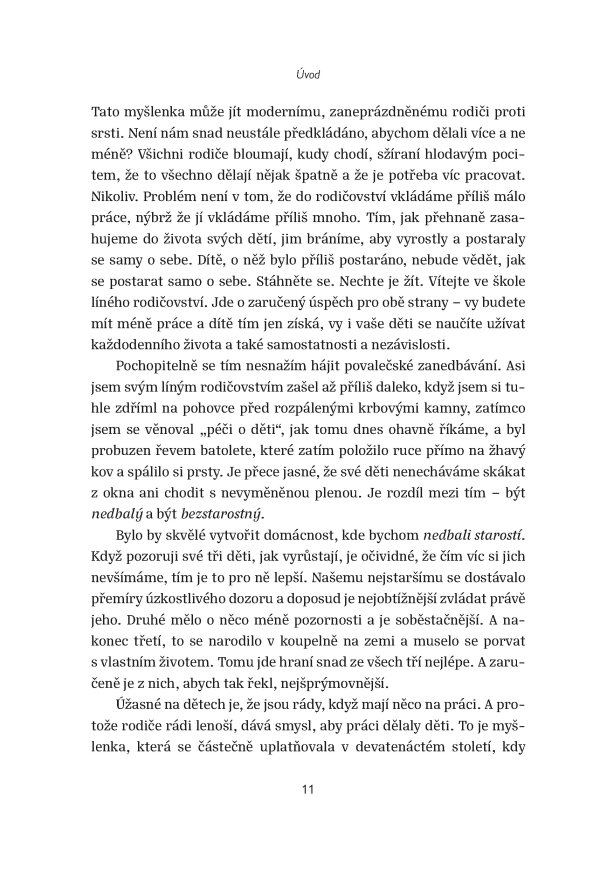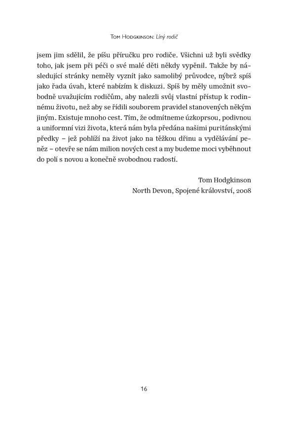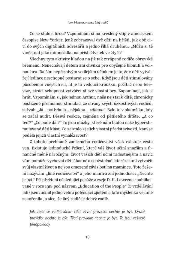 Tom Hodgkinson představuje převratný, a přitom zcela přirozený přístup k výchově dětí. Vychází z prosté, ale geniální myšlenky D. H. Lawrence, že nejlepší věc, kterou pro své děti můžeme udělat, je nechat je na pokoji. To samozřejmě neznamená zanedbávat je. Ponechejme jim ale tolik volnosti, aby dokázaly vyrůst v soběstačné, sebejisté, šťastné a svobodné jedince. Přestaňme je cepovat a místo toho rozvíjejme přirozené dětské instinkty tvořivosti a nezávislosti. Prospějeme tím nejenom jim, ale i sobě.
