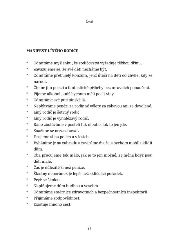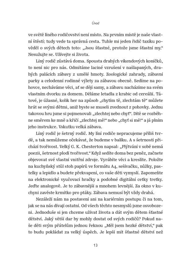 Také máte pocit, že jste se stali otroky svých dětí? Z přehnaně zaníceného rodičovství však vede cesta ven. Existuje jednoduché řešení, které váš život učiní snazším a finančně méně náročným, život vašich dětí učiní radostnějším a navíc vám pomůže vychovat děti šťastné a soběstačné. Toto řešení autor knihy nazývá „líné rodičovství“ a jeho mantra zní jednoduše: „Nechte je být.“ Líný rodič je totiž dobrý rodič. Taková filozofie pravděpodobně může být modernímu, zaneprázdněnému rodiči proti srsti, protože je nám neustále předkládáno, abychom dělali více. Nikoliv. Problém není v tom, že do rodičovství vkládáme málo práce, nýbrž že děláme příliš mnoho. Tím, jak přehnaně zasahujeme do života svých dětí, jim bráníme, aby dospěly a postaraly se samy o sebe. Stáhněte se. Nechte je žít. Vítejte ve škole líného rodičovství. Jde o zaručený úspěch pro obě strany – vy budete mít méně práce a dítě tím jen získá, vy i vaše děti se naučíte užívat každodenního života a také samostatnosti a nezávislosti.