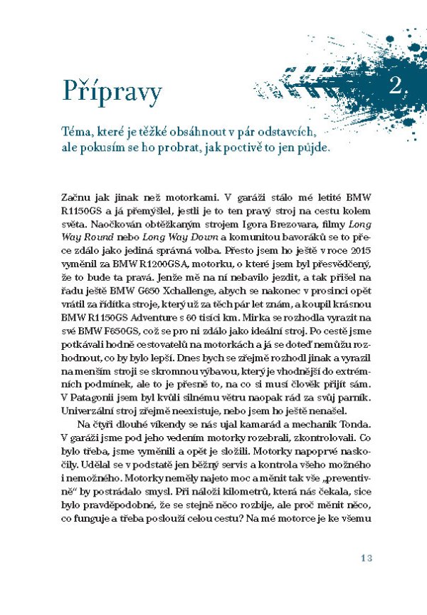 V dubnu 2016, rok a půl od nápadu projet svět, stojíme já a Mirka v centru Brna na startu naší životní cesty. Mísí se v nás strach i vzrušení, teď už se cuknout nedá. Následující skoro dva roky nás naše věrné stroje dennodenně unášejí krajinou vstříc novým zážitkům. Od pouští Íránu přes velehory střední Asie až do Země vycházejícího slunce. Přes oceán do nejjižnějšího města světa, kolem solných plání, inckých památek a zasněžených vrcholků And až do zemí kávy, kakaa a rumu.