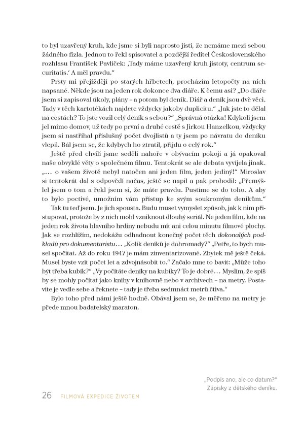 Tato kniha není životopisem Miroslava Zikmunda. Je to pozvánka do světa pověstného archivu. Je to posezení u stolu s Miroslavem Zikmundem. Nalejete si hlteček slivovice do kameniny anebo sklenku těžšího, plnějšího červeného vína, takhle to děláváme my. Můžeme vás ujistit, že za každým příběhem se kromě jiného skrývá i konkrétní debata, kterou jsme vedli a která uváděla témata v souvislosti. Je to vstupenka do lunaparku jménem život (anebo dějiny), kde si sednete tu na horskou dráhu, tu do domu hrůzy, jindy vás odnese tobogán jménem náhoda. Půjdete s námi po stopách vzniku filmu Století Miroslava Zikmunda, po stopách života Miroslava Zikmunda a tím i po mezních situacích celé naší republiky. Jak Miroslav Zikmund říká: „Byl jsem zplozen ještě za Rakouska-Uherska a narodil se do prvních dnů republiky. Proto ji celý život považuji za svého o krapátek staršího bráchu.“