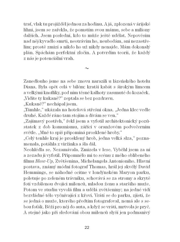 Kdy se stává z pomsty odpuštění? Je pykat naživu horší než smrt? Dřímá v každém z nás potenciální vrah? Jaké má následky propojení posttotalitní oligarchie s „nezávislou“ justicí? A jak do příběhu vstupují herečka Kim Novak, hvězda Hitchcockova Vertiga, slavný spisovatel Graham Greene či lovec nacistů Simon Wiesenthal?