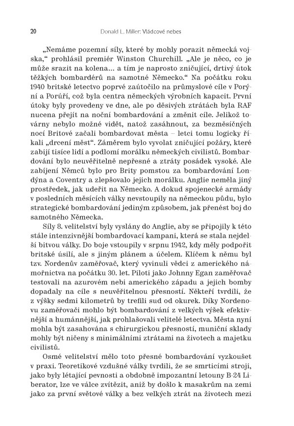 „V prvních letech druhé světové války byli jedinými americkými oběťmi na evropské půdě letci sestřelení z oblohy. Dlouho před Normandií vedli američtí ,hoši od bombardérů‘ nejdelší spojeneckou kampaň druhé světové války a přivedli válku k Hitlerovi. Nyní máme to štěstí, že nám nepřekonatelný Donald Miller vzpomínku na tyto mistry letectva vrátil.“