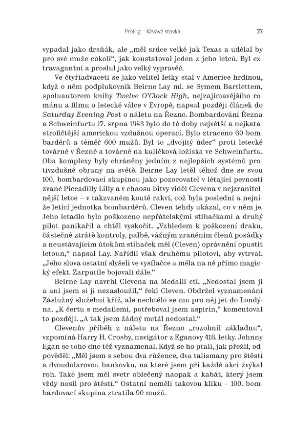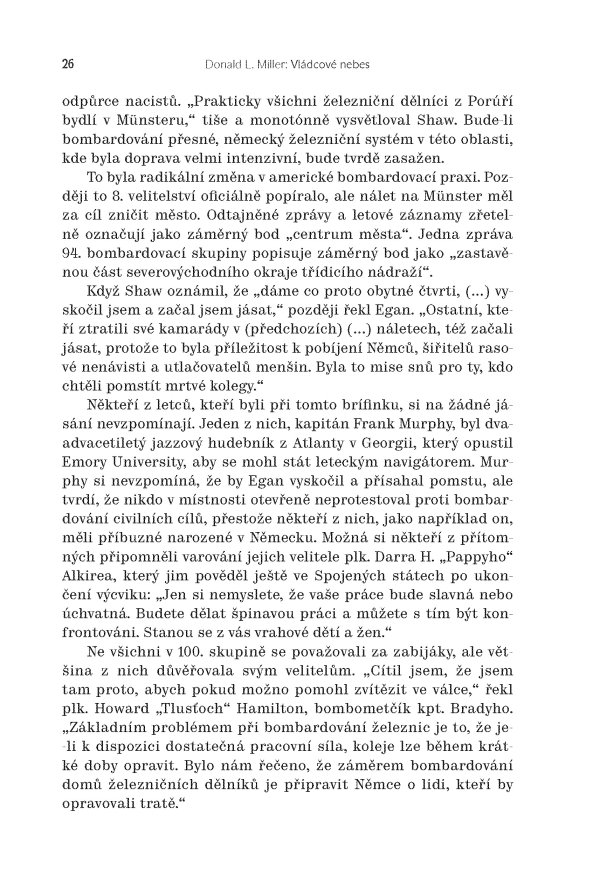„Šedesát let jsme čekali na publikaci, která by autenticky popsala akce osmé letecké armády - boj se stíhači, protiletadlovou obranou i počasím, na bojišti pohybujícím se rychlostí tří mil za minutu pět mil nad zemí. Nyní je tady. Donald Miller brilantně vykresluje příběh mužů, kteří obsluhovali tato letadla.“