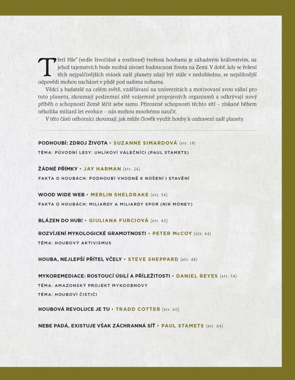 Kniha přináší nejnovější poznatky, jak mohou houby pomáhat v boji s klimatickou krizí, podporovat udržitelnost a stát se přirozenou součástí moderní medicíny. Nabízí také pohled na to, jak může mykologická revoluce otevřít dveře k hlubšímu pochopení vědomí, regenerace i samotného života.